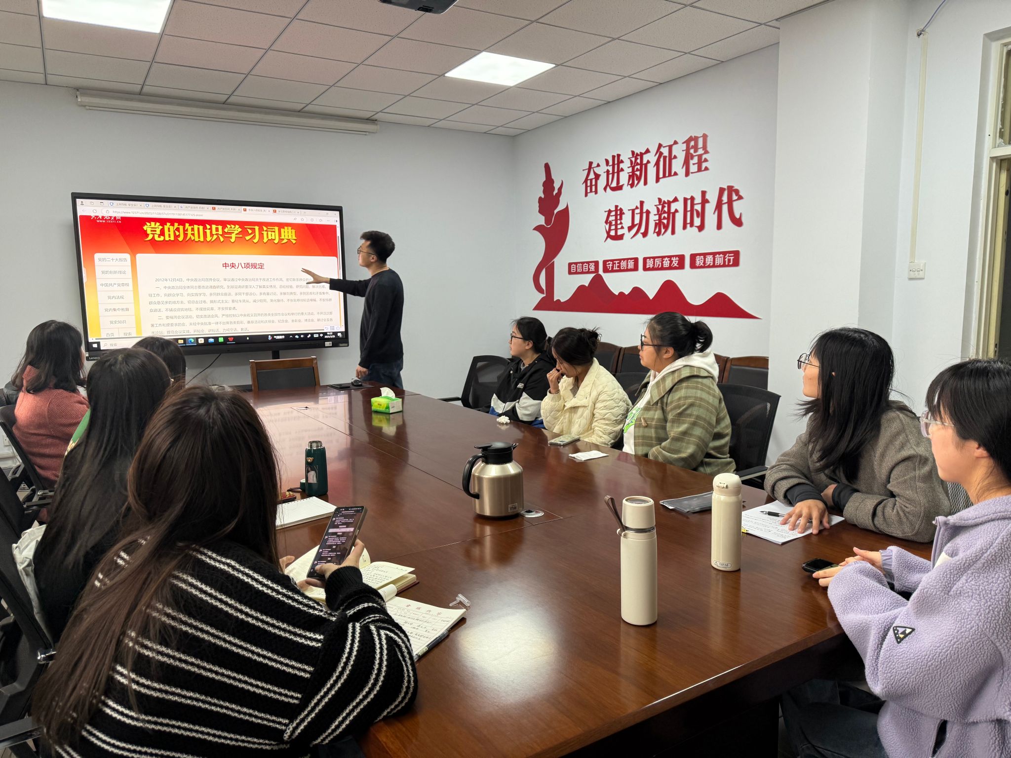 首先,李彬彬老师对中央八项规定精神的内容进行领学并讲解。他强调要认真学习领会习近平总书记关于加强党的作风建设和中央八项规定精神,保证学有质量;坚持统筹兼顾,把学习教育与学习贯彻习近平总书记重要讲话、重要指示精神和党中央重大决策部署贯通,与学习党章党规党纪等贯通。会议强调在进行日常学习工作中要坚持了解真实情况,总结经验、研究问题、解决困难。强调我们要向实践学习,多交流,多商讨,多听取大家的意见,提升工作效率的同时更为注重工作效益,加强实践拒绝空谈。此外,李彬彬老师就毕业生党员的就业规划展开指导,强调无论面对何种行业与岗位,都要有强烈的责任意识与担当,以扎实的专业素养与学习能力深入社会实现自我价值的同时积极服务于社会。最后会议还了解了党员同志们最近在学习生活中的问题,并给予了相应建议。