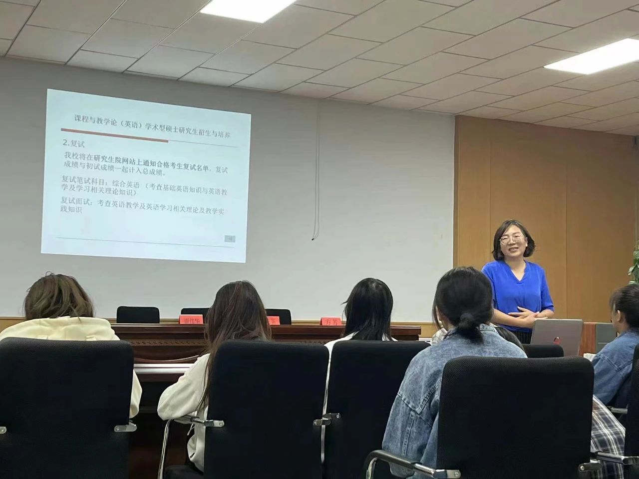 讲座内容分为四个部分,分别是学位点基本情况,团队队伍及导师介绍,初试大纲介绍和复试大纲介绍。首先,老师介绍了外国语言文学有外国语言学及应用语言学和英语语言文学两个硕士点,介绍了专业主要研究方向及基本情况。其次,老师为同学们讲解初试和复试大纲的基本信息,考试目的,考试性质及范围,考试要求和考试内容。最后,老师们讲解了课程与教学论(英语招生与培养)报考条件,报名流程考试,以及学科专业及研究方向考核方式。此外还介绍了内蒙古师范大公司园以及校园里的景点景色,同时欢迎同学们报考内蒙古师范大学。