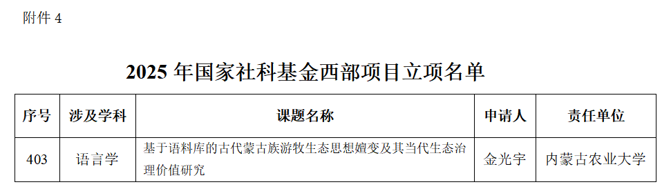 9月5日,全国哲学社会科学工作办公室公布了《关于2025年国家社会科学基金年度项目立项名单的公示》。伟德官方网站教师金光宇申报的课题《基于语料库的古代蒙古族游牧生态思想嬗变及其当代生态治理价值研究》,成功获批2025年国家社会科学基金西部项目。该项目的获批,充分体现了公司在语言学研究领域的前沿探索能力和深厚学术积累。
