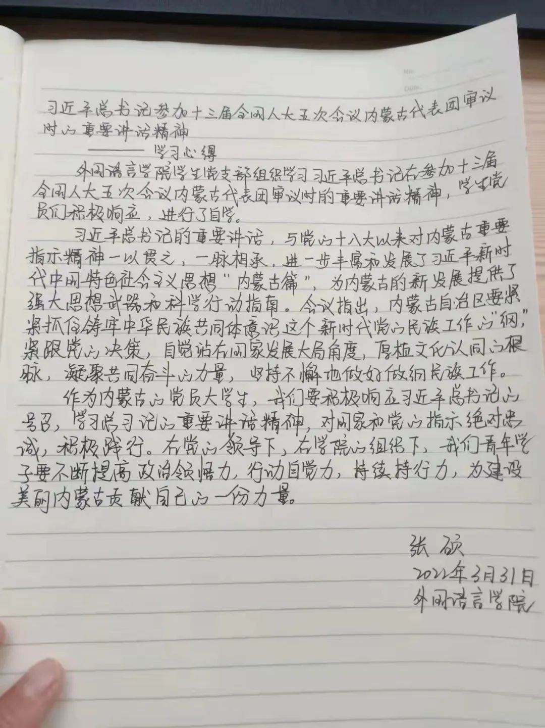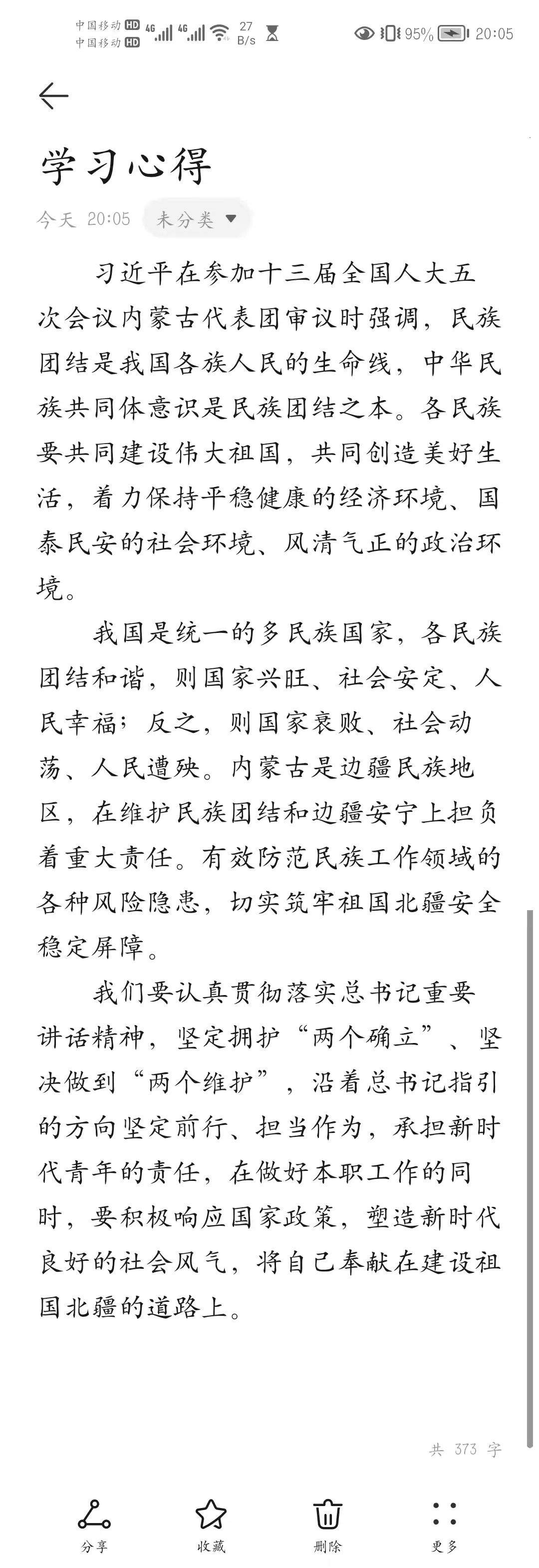 习近平总书记在参加内蒙古代表团审议时的讲话中强调,要不断巩固中华民族共同体思想基础,促进各民族在中华民族大家庭中像石榴籽一样紧紧抱在一起,共同建设伟大祖国,共同创造美好生活。民族团结是我国各族人民的生命线,中华民族共同体意识是民族团结之本。我们作为在内蒙古自治区多民族共同生活中的一员,大家共居、共学、共事,要更加坚守这一准则,在大公司园里交往交流,融洽相处,相互包容,形成你中有我、我中有你、谁也离不开谁的共同体,铸牢中华民族共同体意识教育,践行初心和使命。