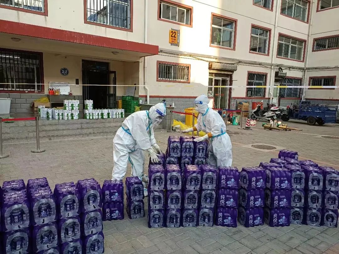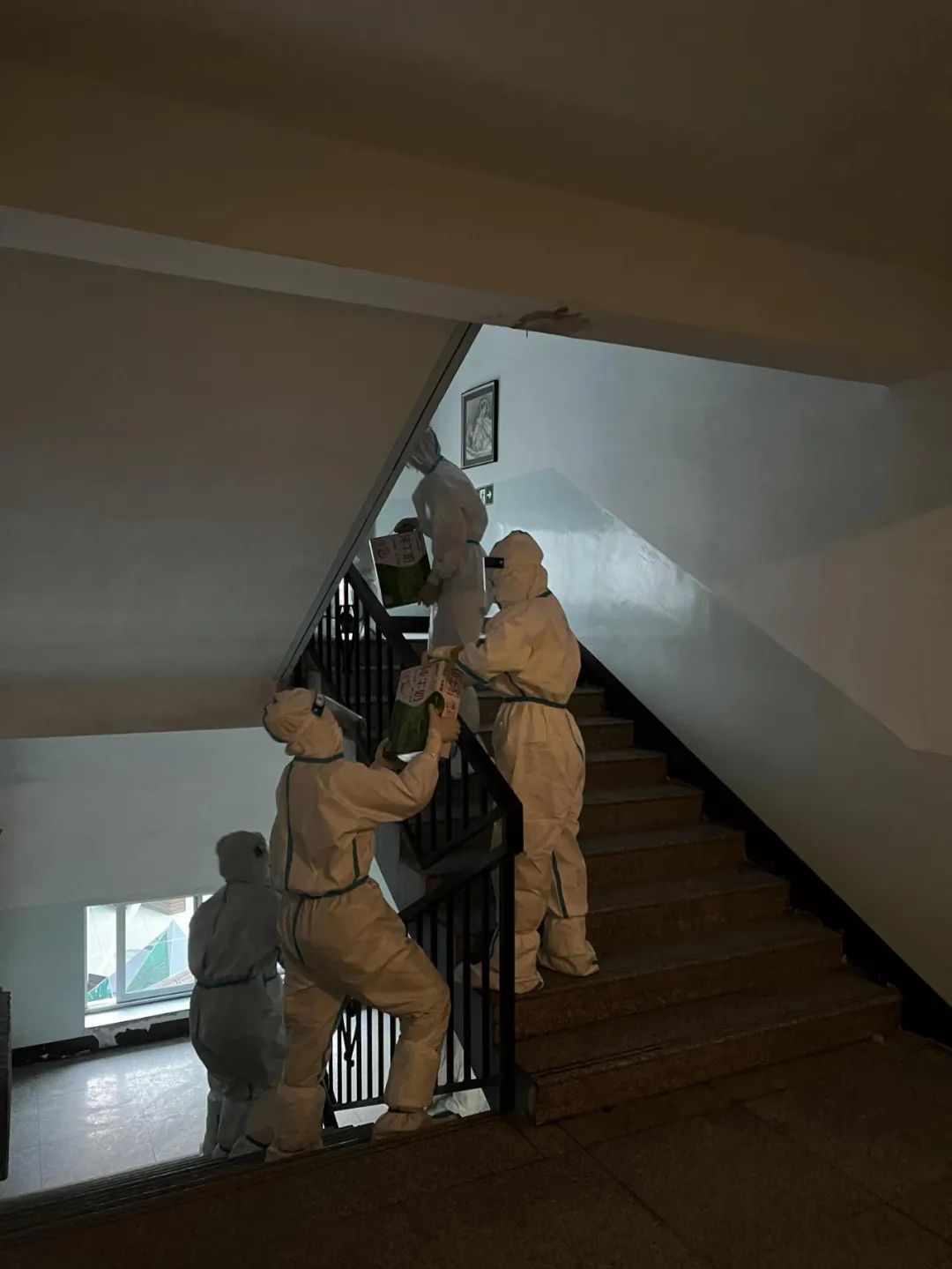22 号楼一共六层楼,是东区员工人数最多的宿舍楼,但是能启用员工志愿者的情况有限,大部分工作需要老师来做。面对艰苦的环境,老师们没有选择放弃,反而自创了许多方法来克服困 难,提高工作效率。如老师们在楼梯间接力运整提矿泉水、传递装满水的热水壶、运送牛奶、 饭菜,以此保障员工们的供给。
