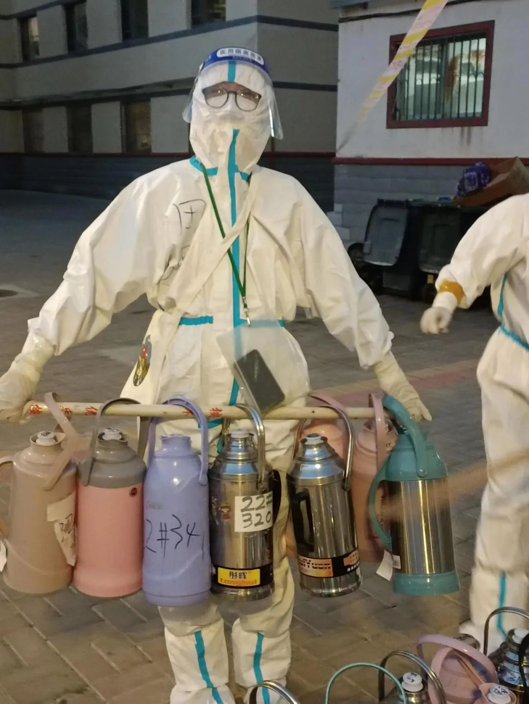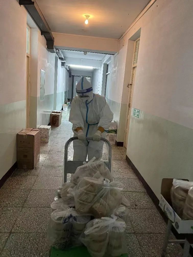 10 月 22 日,东区 22 号楼志愿者急需补充,响应公司公司号召,田原老师安顿好家中两个孩子,带着简单的行李入驻东区 22 号楼员工公寓。田原老师主要负责 22 号楼三层 40 多个宿 舍,221 名同学的饮食,早上六点,当同学们还在熟睡的时候,田原老师已经穿上了防护服, 穿梭在校园里,开启了一天的工作。派发早餐,运送牛奶,发放热水。从早到晚,上楼下楼, 下楼上楼。为了保证同学们尽快用上热水,瘦弱的田老师巧用工具,一次能运送八个大暖壶。为了让同学们尽快吃上一口热乎饭,田老师只在穿防护服前喝了一杯牛奶,就一直忙碌在公寓楼里。