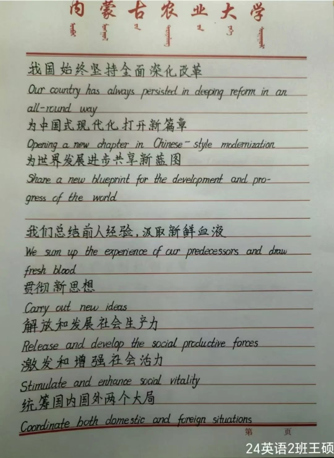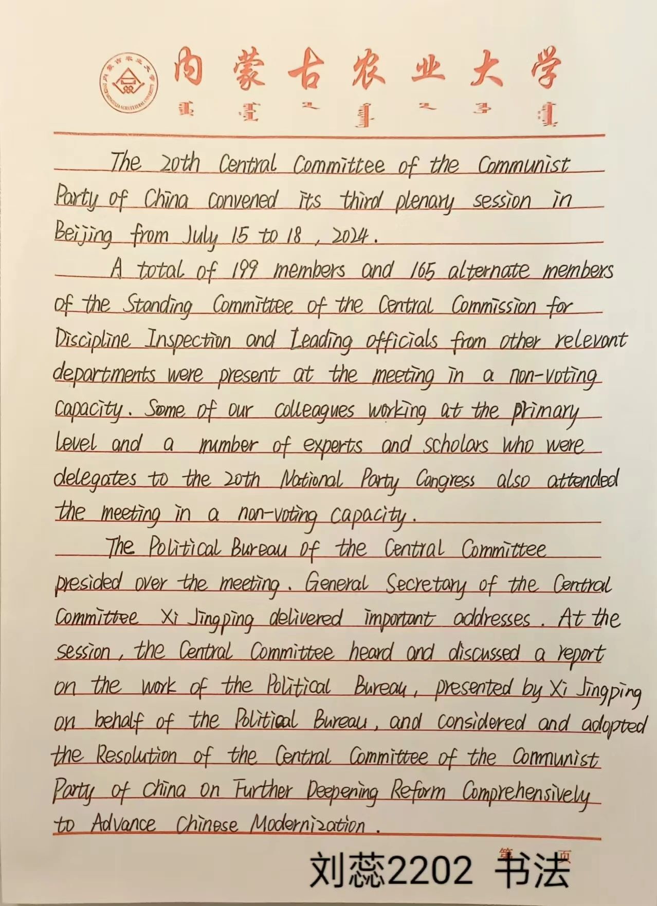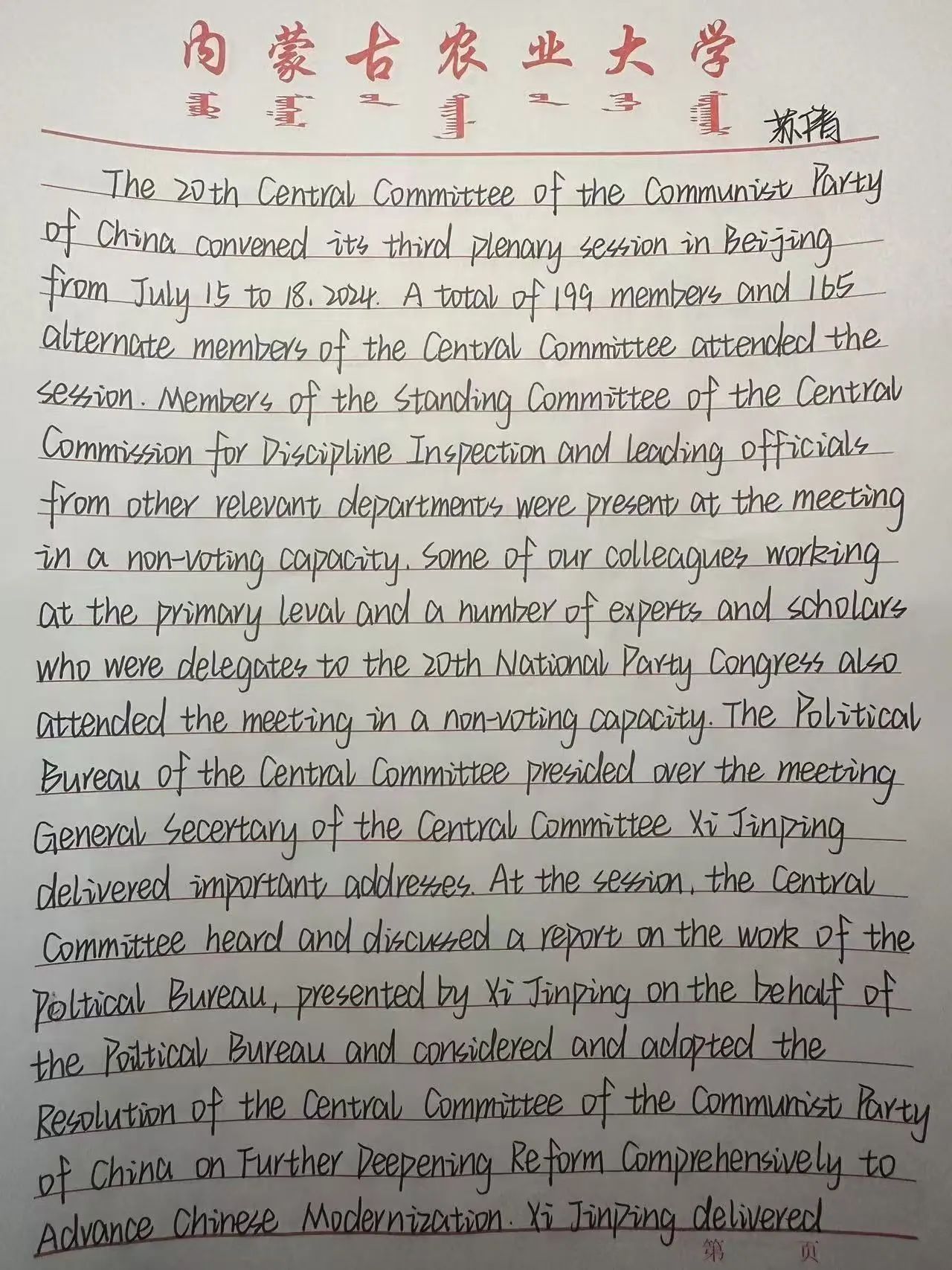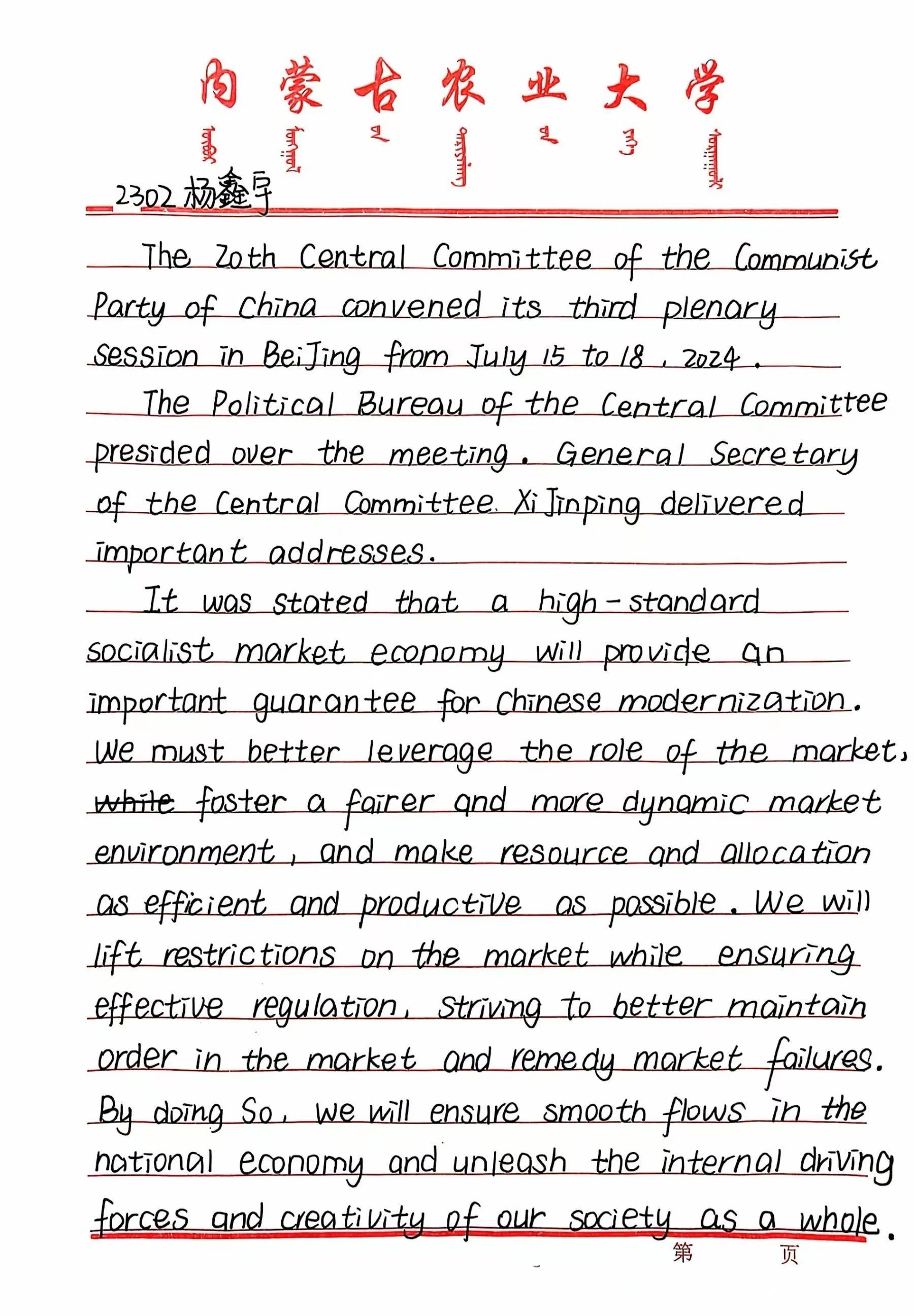 作为一名大学新生,我深感自己肩负的历史使命。在未来的学习和生活中,我将努力学习专业知识,不断提升自己的综合素质,培养创新精神和实践能力,为将来投身国家建设做好准备。同时,我也要积极参与社会实践,关心国家大事,将个人的发展与国家的命运紧密联系在一起,以实际行动践行二十届三中全会精神。