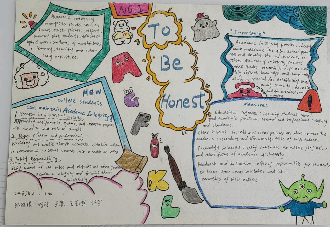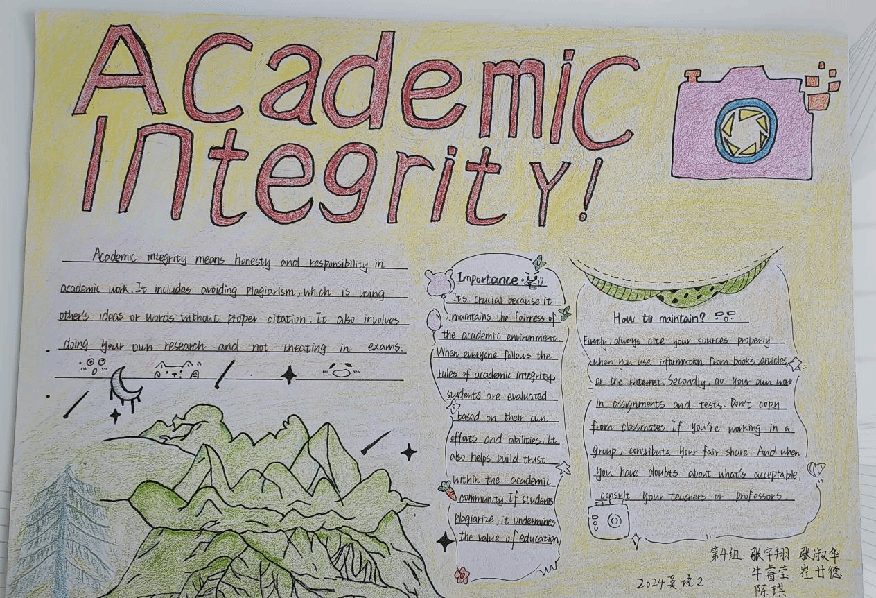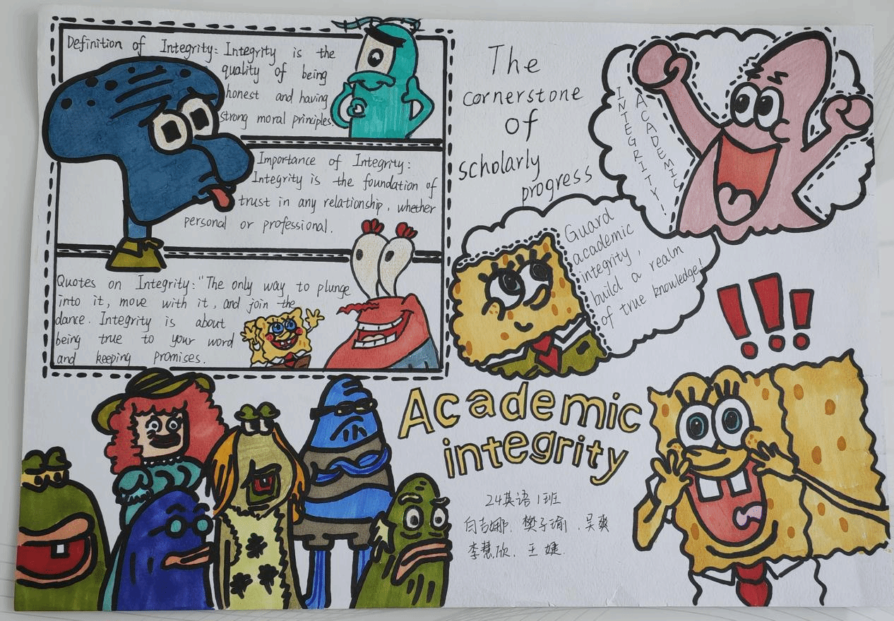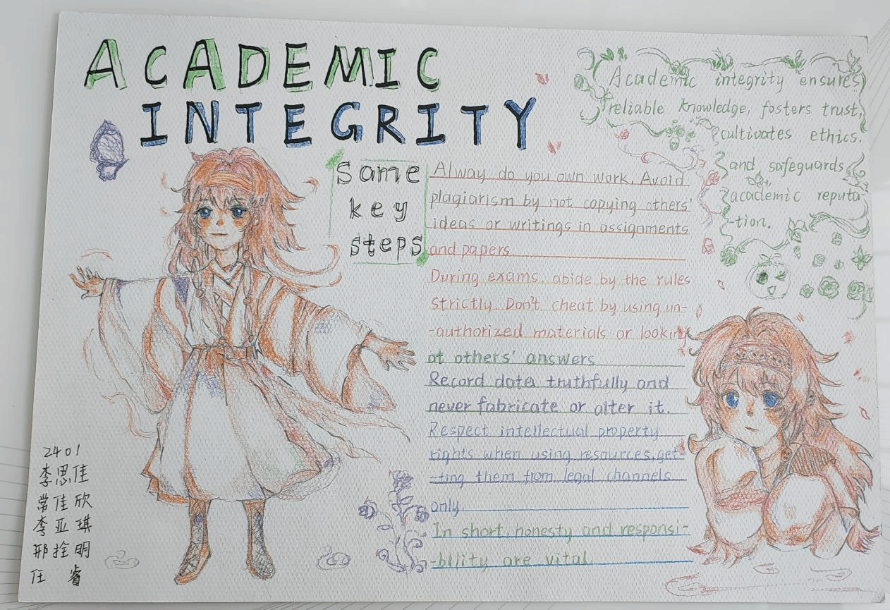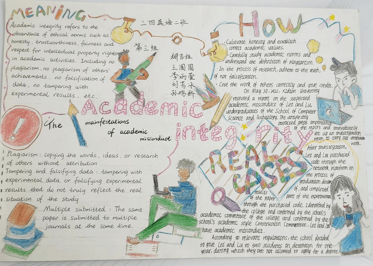 为了充分发挥外语课程的思政育人功能,提升员工的诚信意识,“英语视听说”课程组教师结合教材单元主题(Integrity诚信),对教学内容进行重构和补充,将知识传授、能力培养和价值塑造有机融合进行教学设计。在24级英语专业1、2班的英语视听说教学中,课上完成多样化听说任务和听力策略训练之后,鼓励员工课下进行小组合作,结合视听材料(Academic Integrity学术诚信)的观点内容和语言结构,通过绘制手抄报深刻理解学术诚信的价值蕴含和实践路径。