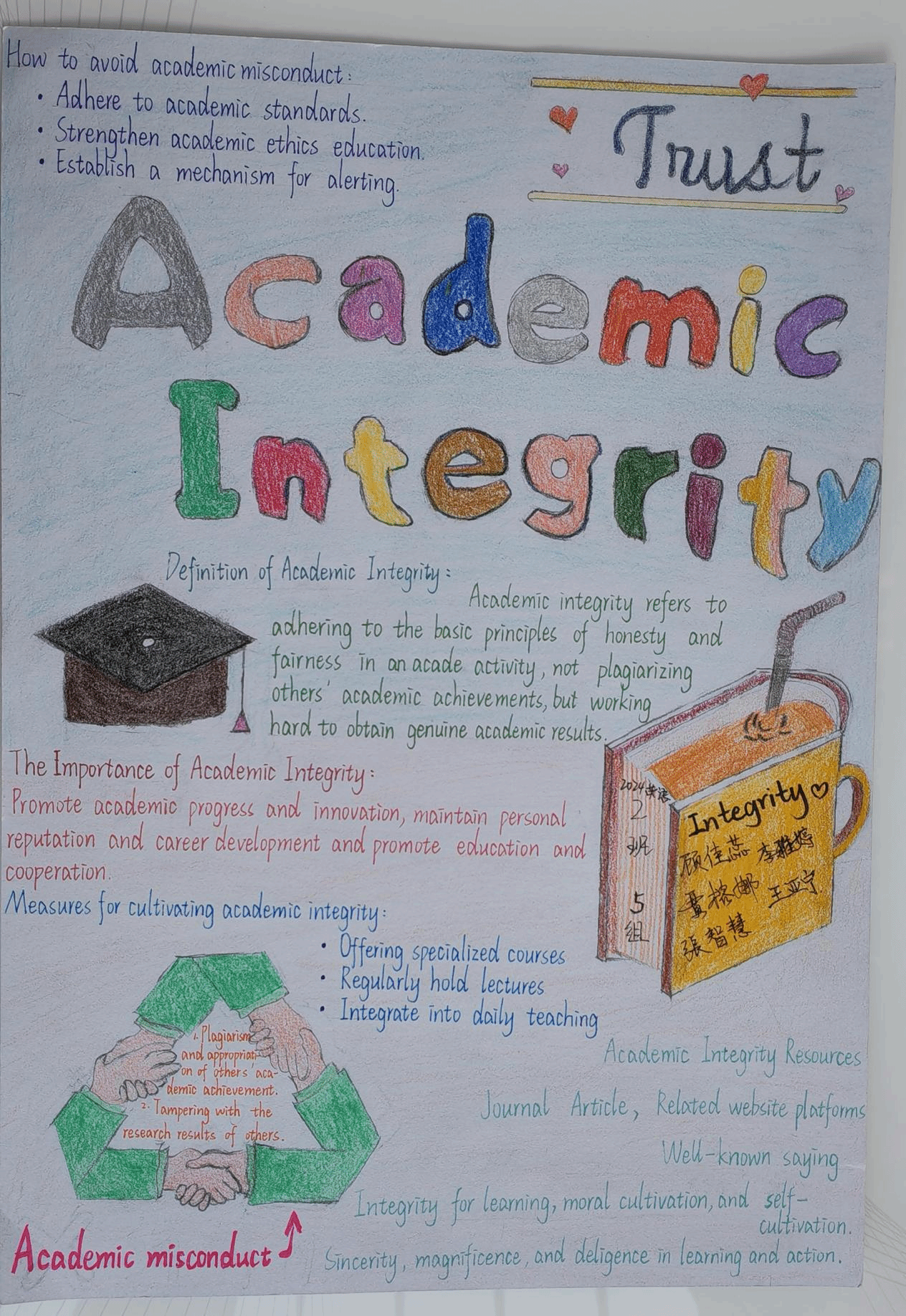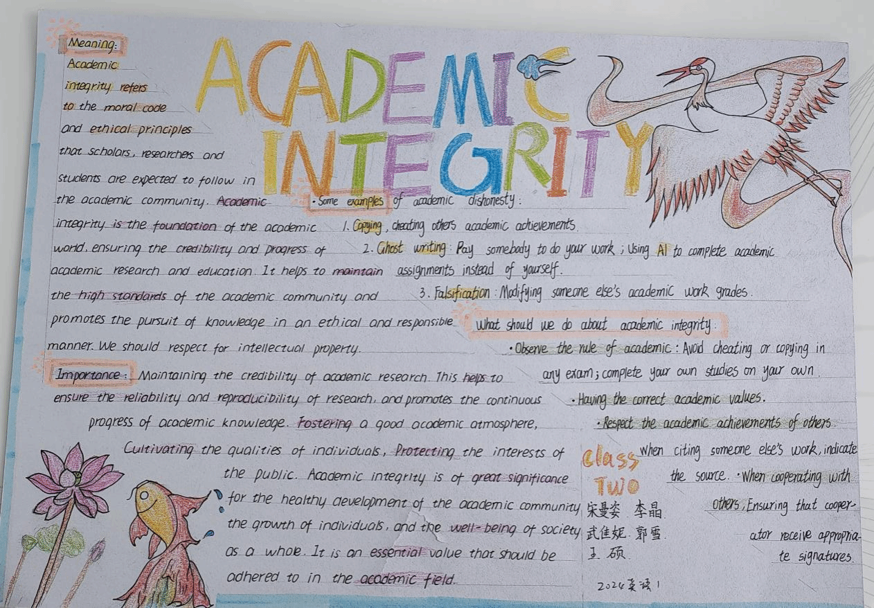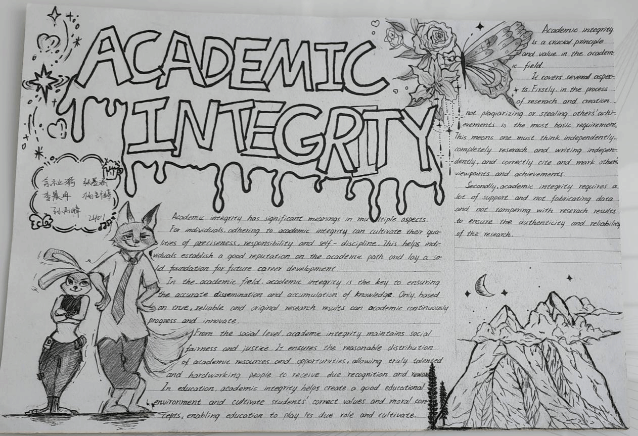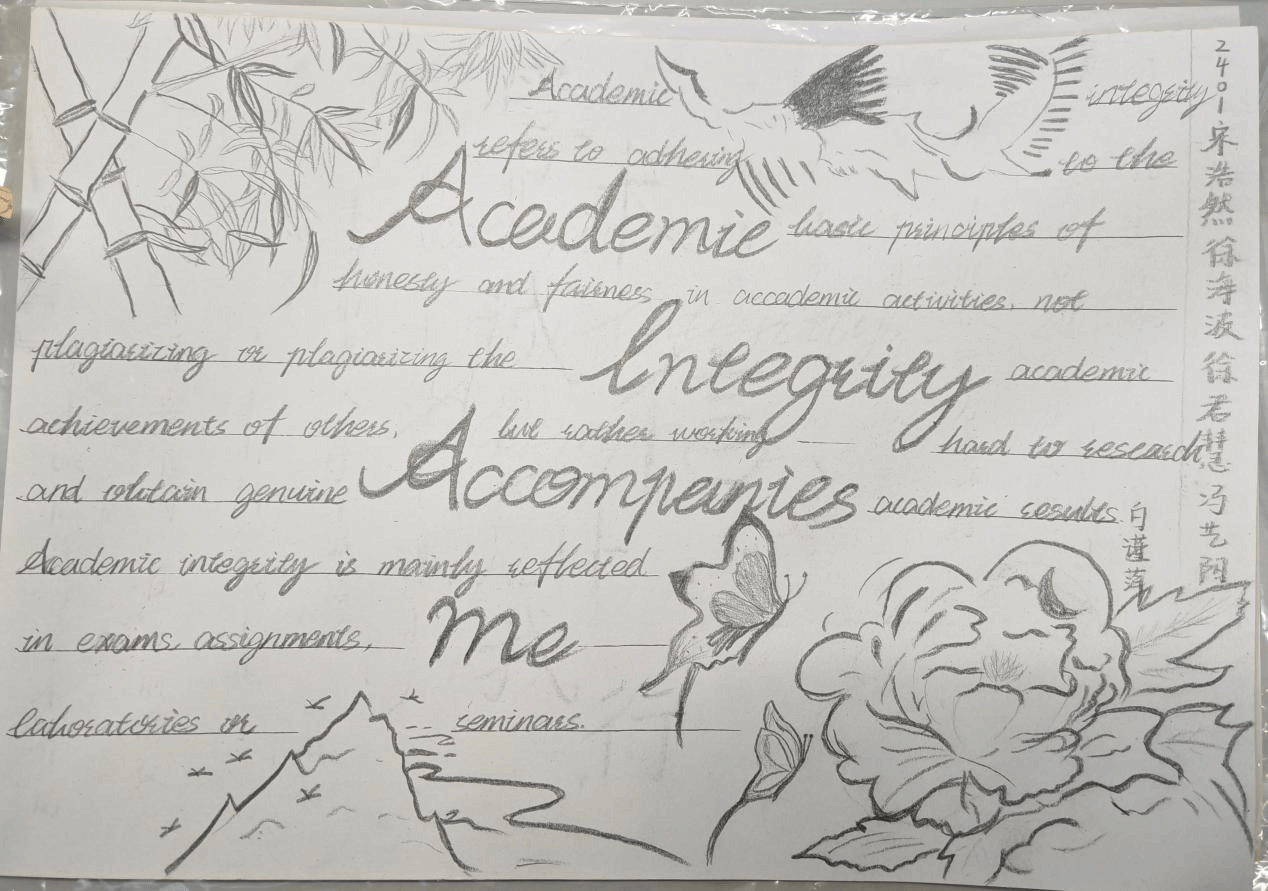 为了充分发挥外语课程的思政育人功能,提升员工的诚信意识,“英语视听说”课程组教师结合教材单元主题(Integrity诚信),对教学内容进行重构和补充,将知识传授、能力培养和价值塑造有机融合进行教学设计。在24级英语专业1、2班的英语视听说教学中,课上完成多样化听说任务和听力策略训练之后,鼓励员工课下进行小组合作,结合视听材料(Academic Integrity学术诚信)的观点内容和语言结构,通过绘制手抄报深刻理解学术诚信的价值蕴含和实践路径。