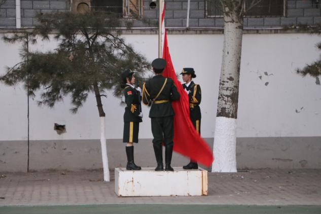 6:50,参与人员准备就位,7:00升旗仪式正式开始。现场随着仪仗队的出现而安静下来。在全体同学的注目礼下,英姿飒爽的国旗护卫队队员们护送鲜艳的五星红旗进场,伴随着庄严的中华人民共和国国歌,五星红旗冉冉升起,迎风飘扬。在场的同学们向国旗行注目礼,深怀对祖国无限的热爱和崇高的敬意。