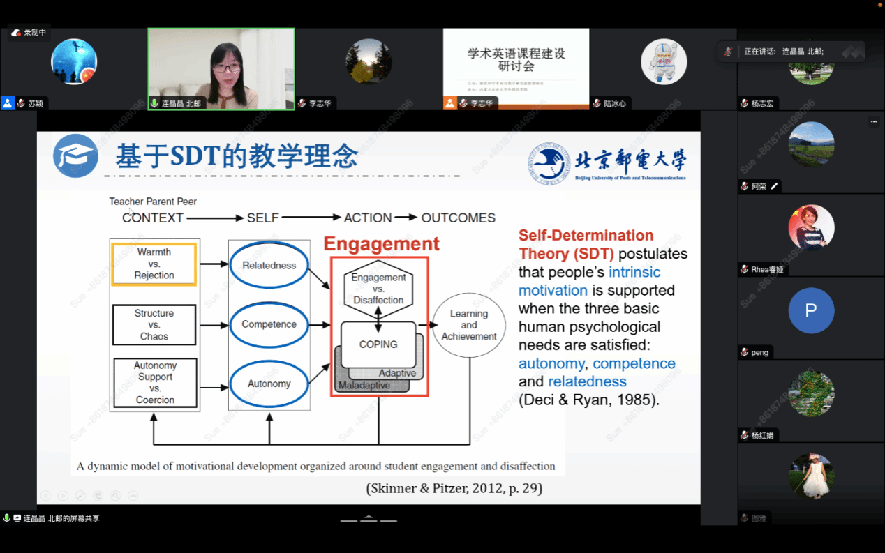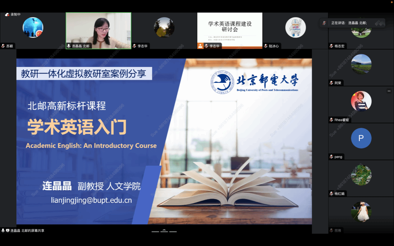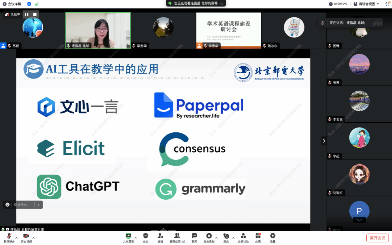 本次研讨会我们特别邀请了北京邮电大学连晶晶老师就如何打造高质量学术英语课程、课程教学如何与教改项目相结合以及如何利用AI工具辅助学术英语教学和研究等三个方面内容做了讲座。