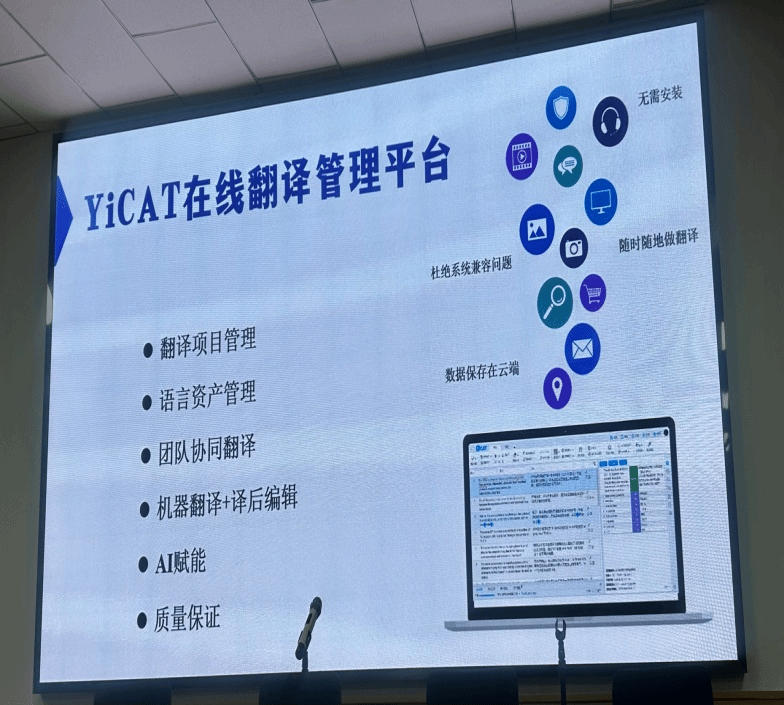 讲座共分为:译有何技、彼有何需、知彼知己和未雨绸缪四个部分。随着人工智能技术的不断进步,翻译行业正面临着前所未有的变革。刘思畅经理首先对计算机辅助翻译的基本原理进行了深入浅出的讲解,阐述了该技术的发展优势及其在现代翻译行业中的重要性。随后,他详细介绍了当前市场上常用的线上及线下翻译工具,并重点介绍了在高级翻译场所中应用的翻译管理系统,为师生们提供了宝贵的技术见解和实用信息。在实际操作环节,刘经理展示了YiCAT在线翻译管理平台的应用。通过搭载ChatGPT翻译引擎AI助手,YiCAT使译前、译中、译后各阶段更智能化。之后他通过现场互动的方式,对MTI同学的就业方向给予专业的指导和建议。