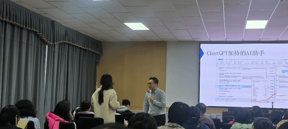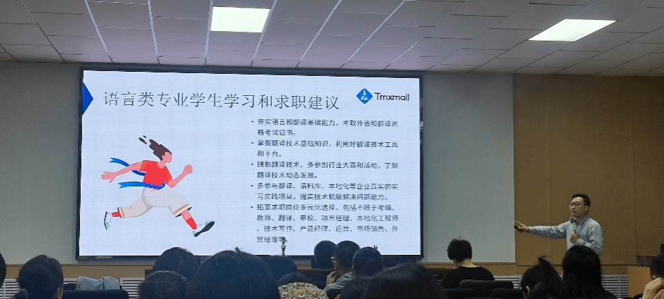 讲座特邀上海一者信息科技有限公司的两位技术大咖,区域总监杨勇峰和运营经理刘思畅。刘思畅经理担任主讲,旨在介绍计算机辅助翻译(CAT)技术的最新发展及其在翻译实践中的应用。