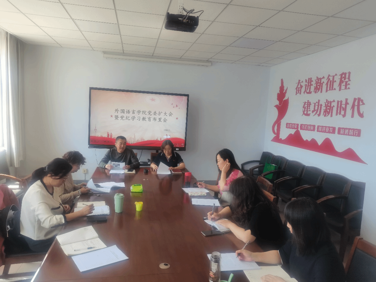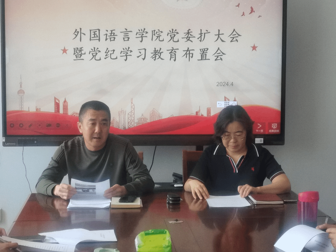 2024年4月16日中午12点30分,外语公司召开党委扩大会议暨党纪学习教育布置会。会议由曹立军书记主持。全体党委委员和支部书记参会。